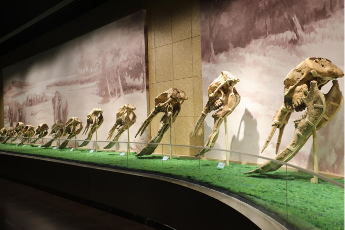 和政古动物化石博物馆内陈列的24具铲齿象头骨化石。新华社记者 胡伟杰 摄