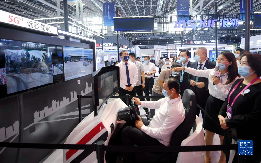 9月6日,参观者在博览会上参观5G远程驾驶系统。新华社记者 王晓 摄