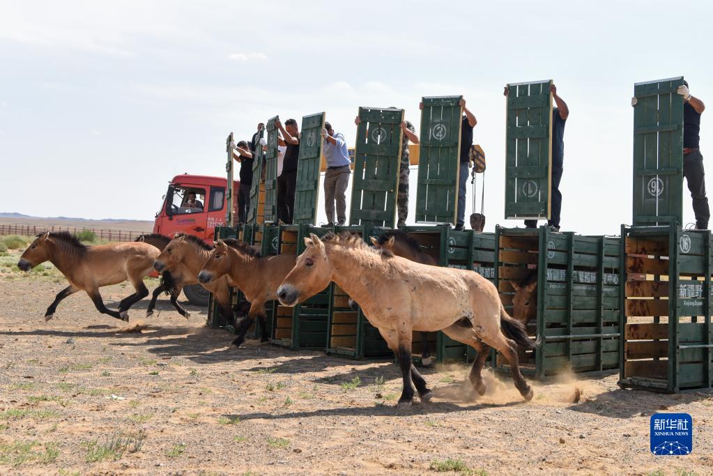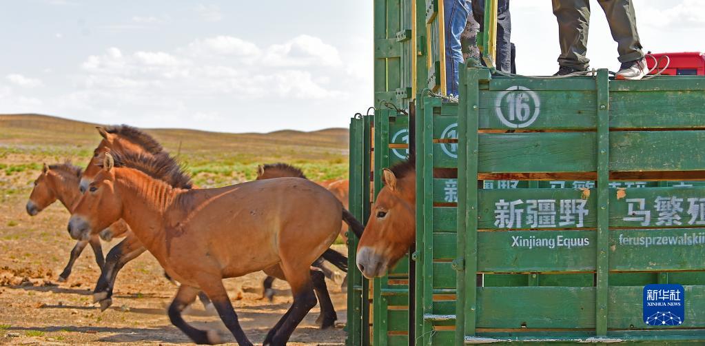 在新疆卡拉麦里山有蹄类野生动物自然保护区乔木西拜野放点,工作人员将即将野放的野马放入大围栏,使其适应野外环境(9月1日摄)。 新华社记者 侯昭康 摄