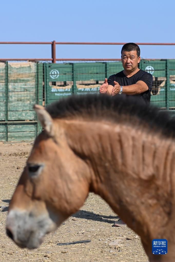 在新疆卡拉麦里山有蹄类野生动物自然保护区乔木西拜野放点,王振彪查看野马身体状况(9月1日摄)。 新华社记者 丁磊 摄
