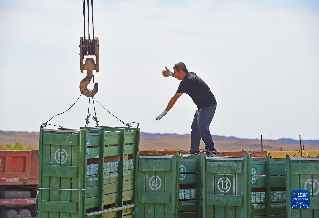 在新疆卡拉麦里山有蹄类野生动物自然保护区乔木西拜野放点,工作人员卸下运马箱(9月1日摄)。 新华社记者 侯昭康 摄