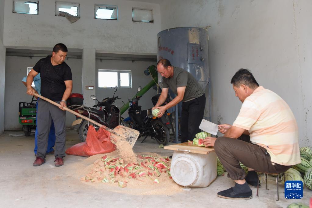 在新疆野马繁殖研究中心,工作人员为野马制作“西瓜解暑餐”(8月10日摄)。 新华社记者 丁磊 摄