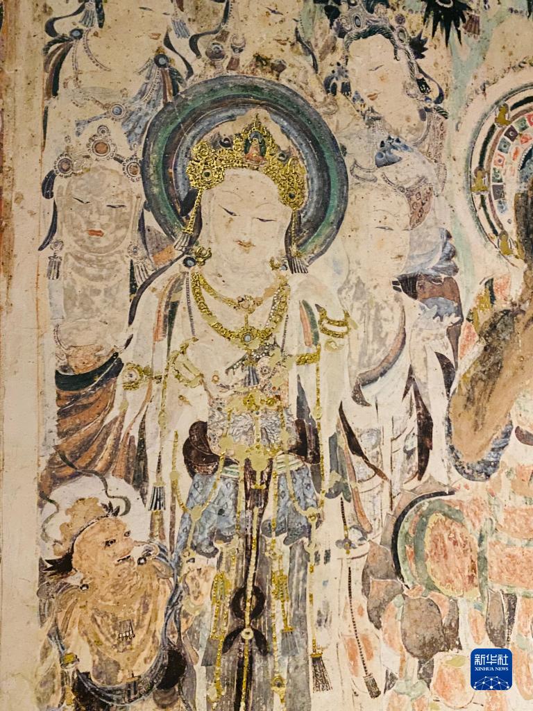这是9月13日在日本东京艺术大学美术馆拍摄的用“文化遗产克隆技术”做出的敦煌莫高窟第57窟壁画《弥勒说法图》局部。新华社记者 郭丹 摄