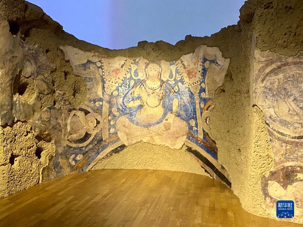 这是9月13日在日本东京艺术大学美术馆拍摄的用“文化遗产克隆技术”做出的阿富汗巴米扬E号窟天井壁画《青弥勒》。新华社记者 郭丹 摄