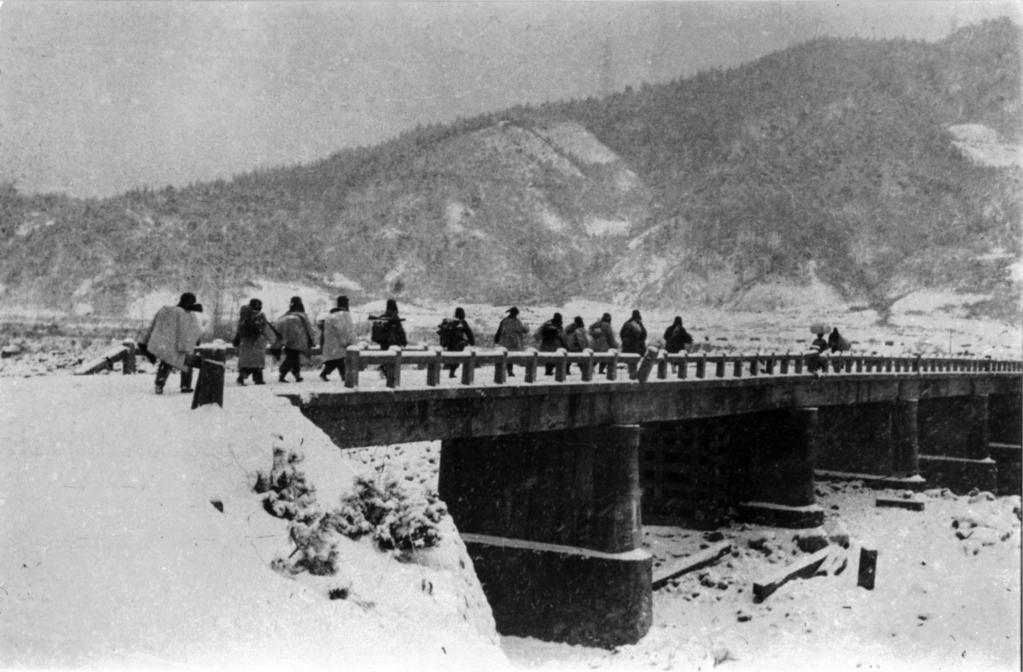 志愿军第9兵团战士通过长津湖大桥(抗美援朝纪念馆供图)