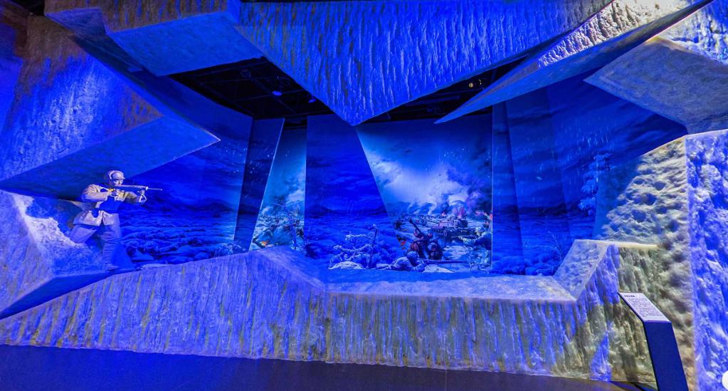 志愿军战士被冻成“冰雕”的画面,在位于辽宁省丹东市的抗美援朝纪念馆“冰雪长津湖”场景中也有体现。“‘冰雪长津湖’以声光电的方式,再现了抗美援朝第二次战役东线的长津湖战役的壮烈场景。通过蓝色的主色调和堆砌的冰雪,观众可以直观地感受到:这场战役中,志愿军面对的主要敌人是寒冷,像炮弹一样可怕。”抗美援朝纪念馆副馆长、抗美援朝研究专家张校瑛说。