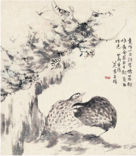 这一年,朱耷似乎兴致很高,除了《瓶菊图》外还创作了《鱼鸟图》以及《安晚册》中的《鹌鹑》,均有题识可考。《鱼鸟图》中石头的造型圆润,用笔圆融,鸟之闲栖、鱼之悠游见诸笔端。“鹌”与“安”谐音,鹌鹑的形象有平安的寓意。画面中两只鹌鹑偏安于怪石之下,石缝中点缀了数朵菊花,生气十足。