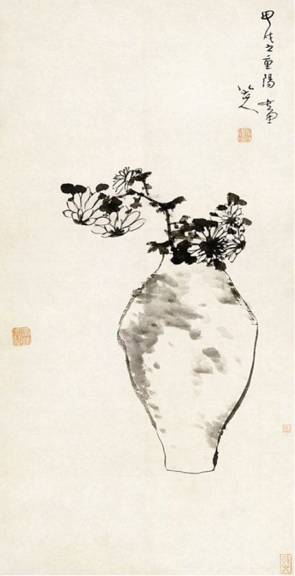 朱耷擅长花鸟、山水、书法,以白眼向天的花鸟闻名于世;但这幅题识为“甲戌年之重阳画”的《瓶菊图》却因其亲切宁静的气息受到世人的钟爱。画中菊花的高低错落、疏密聚散在落笔时就用心经营过了,瓦罐也因柔韧自如的线及透明淹润的点在土气的质感之外又多了一份灵气,画面恬淡、自然。