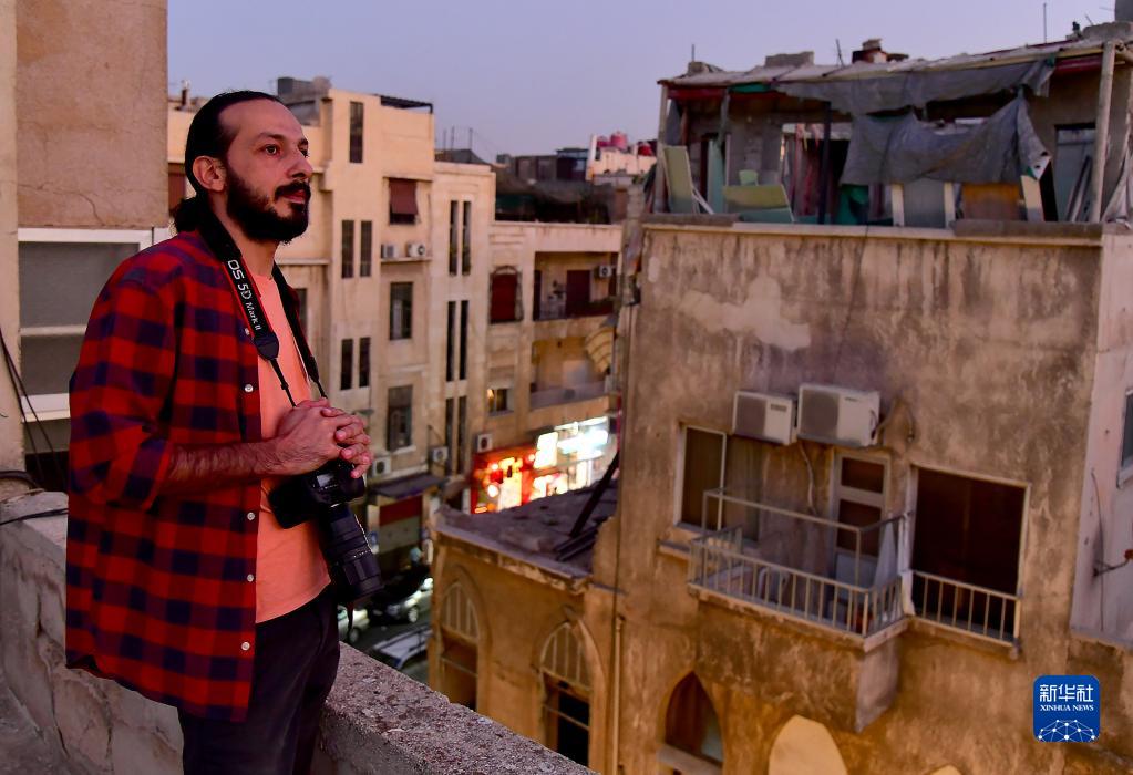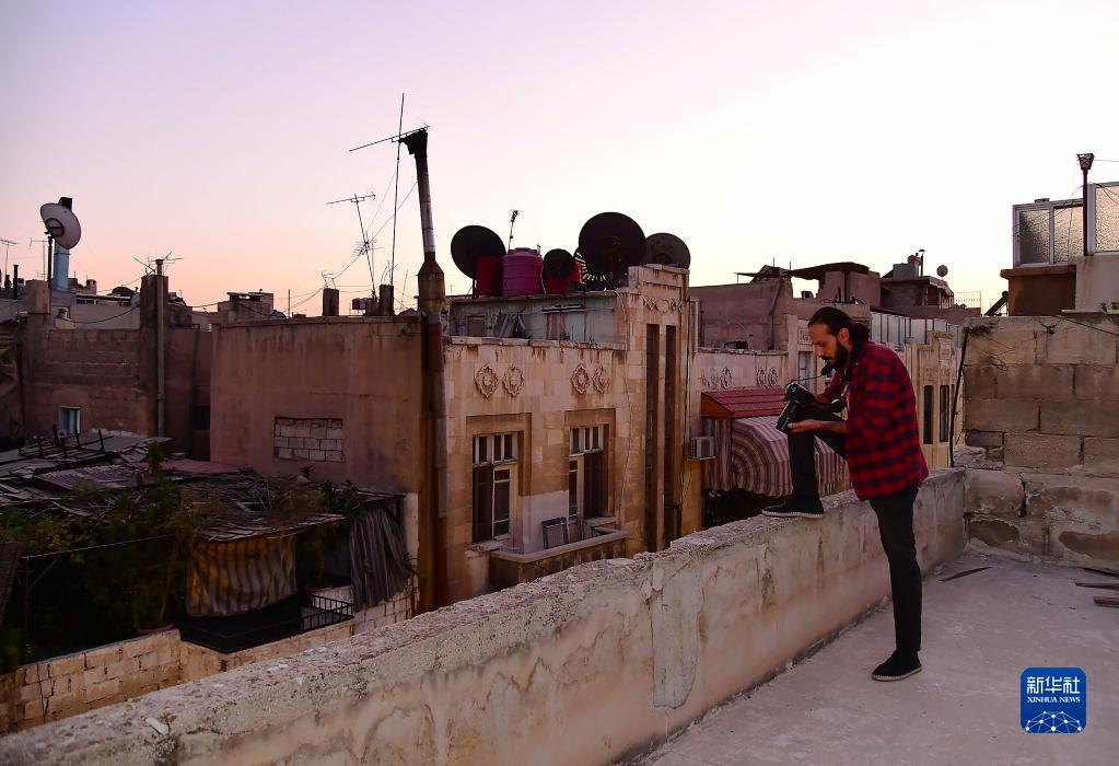 10月9日,在叙利亚大马士革,摄影师奥马尔·马拉斯在房顶天台拍摄。新华社发(阿马尔·萨法尔贾拉尼摄)