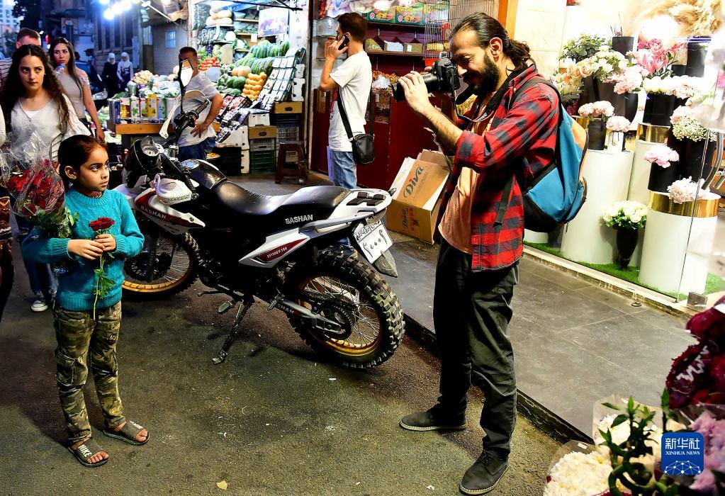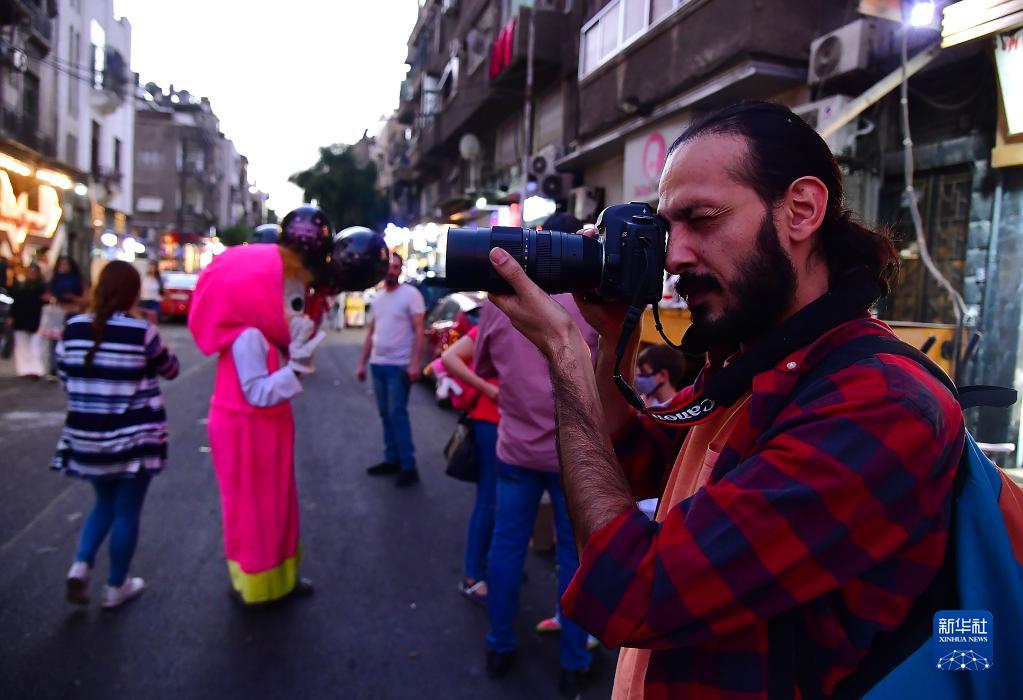 10月9日,摄影师奥马尔·马拉斯在叙利亚大马士革街头拍摄。新华社发(阿马尔·萨法尔贾拉尼摄)