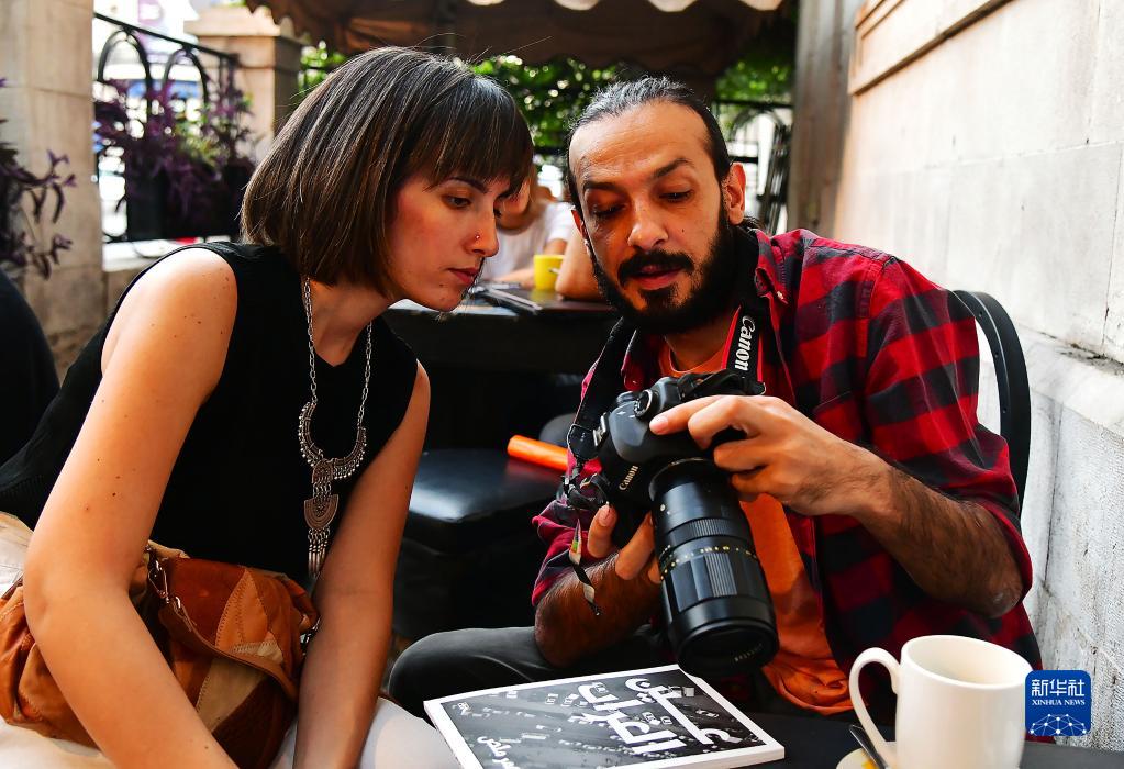 10月9日,在叙利亚大马士革,摄影师奥马尔·马拉斯向友人展示摄影作品。新华社发(阿马尔·萨法尔贾拉尼摄)
