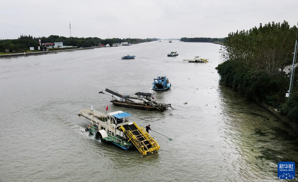 苏浙沪三地的保洁船在位于长三角生态绿色一体化发展示范区的苏浙沪交界水域太浦河流域联合清理水面浮游植物(2020年10月15日摄,无人机照片)。新华社记者 方喆 摄