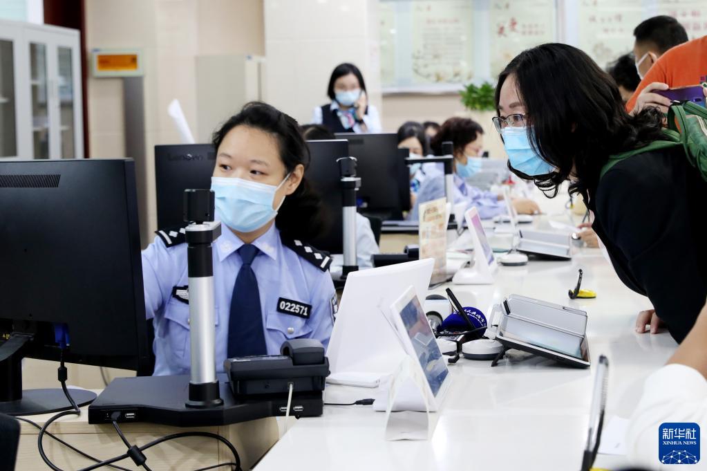 2020年10月14日,原籍浙江湖州的王秀丽(右)在上海市徐汇漕河泾社区事务受理服务中心公安综合窗口办理户口迁移手续,成为享受上海市公安局会同浙江省公安厅共同推出的沪浙“跨省市户口网上迁移”便民措施的第一人。新华社记者 方喆 摄