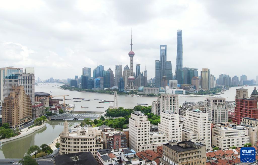 这是8月12日拍摄的上海黄浦江外滩区段两岸楼群(无人机照片)。新华社记者 方喆 摄