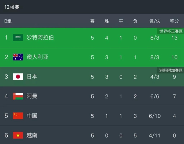 根据规则,B组前两名直接晋级世界杯,第三名将获得参加附加赛的资格。在上一轮比赛1:1憾平阿曼队后,中国队目前积4分排名小组第五,与小组第三日本队、小组第二澳大利亚队的分差已分别达到5分和6分。