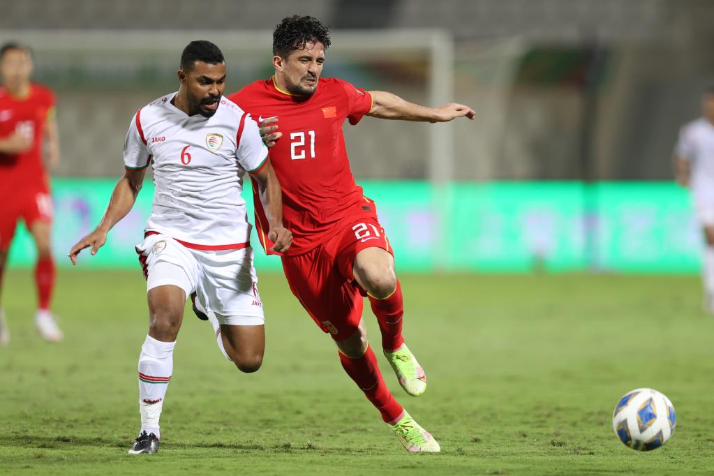 11月11日,中国队球员洛国富(右)与阿曼队球员艾哈迈德·哈米西在比赛中拼抢。新华社发