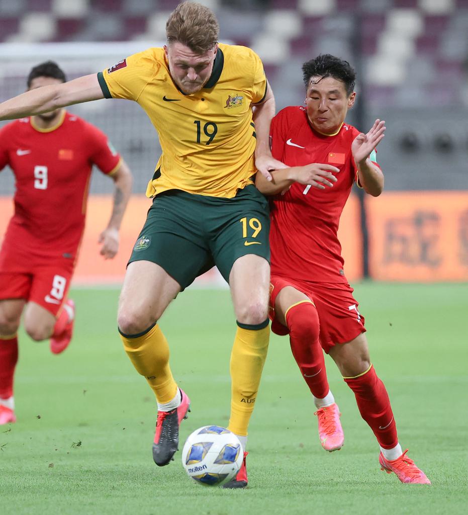 9月2日,中国队球员武磊(右)与澳大利亚队球员苏塔拼抢。新华社发(亚足联供图)