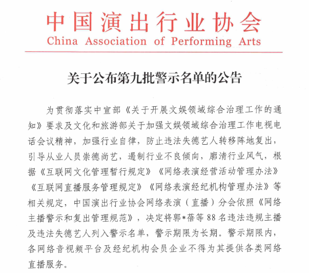 中国演出行业协会网络表演(直播)分会23日发布第九批网络主播警示名单,包括“铁山靠”“郭老师”两名职业主播和“吴亦凡”“郑爽”“张哲瀚”三名演员在内的88名主播将在行业内被实行联合抵制和惩戒。这是违法失德艺人首次被纳入网络主播警示名单中,防止劣迹艺人转移阵地复出。名单向社会公布后将下发各平台予以封禁,并同步报主管部门备案。