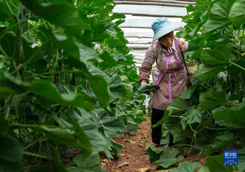 工人在云南元谋县元马镇星火社区的大棚内采摘黄瓜(11月16日摄)。新华社记者 王冠森 摄