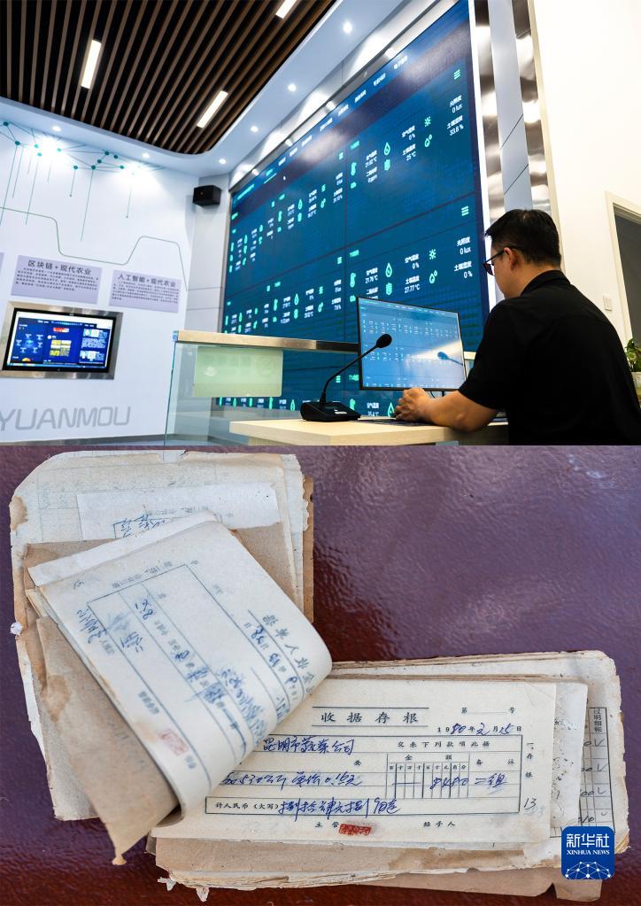 在云南元谋县大塘子村,元谋现代种业科技园的工作人员利用大数据平台记录作物生长、农产品交易等信息(上图),数据记录方式与大塘子农村改革展陈室内陈列的老账簿形成对比(下图)(11月15日摄,拼版照片)。新华社记者 王冠森 摄
