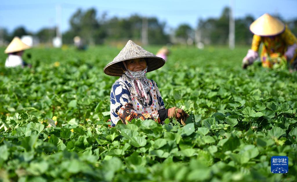 海南省东方市四更镇的农民在田间移栽地瓜苗(11月15日摄)。新华社记者 郭程 摄