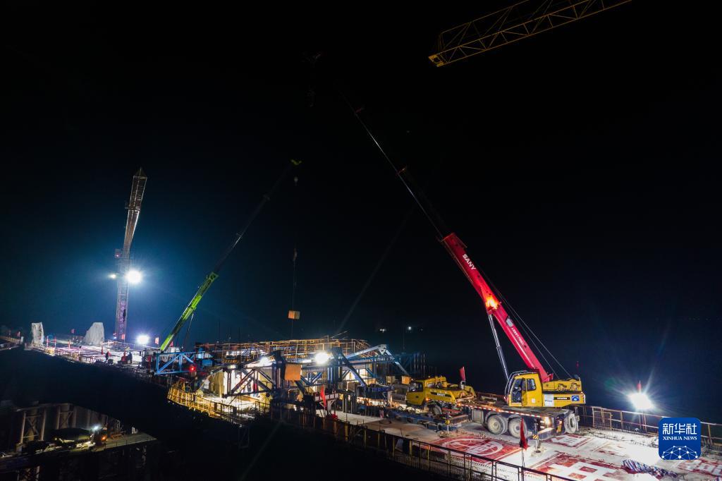 11月27日凌晨,工人们在常益长高铁资水特大桥上进行合龙作业。新华社记者 陈思汗 摄