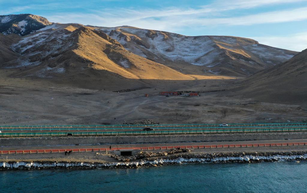 新疆赛里木湖畔,从伊犁哈萨克自治州霍城县转场而来的牧民准备进入冬季牧场(11月23日无人机拍摄)。新华社记者赵戈 摄