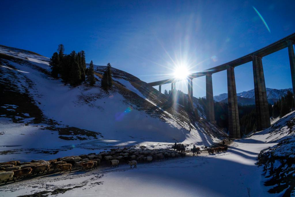 新疆果子沟一处牧道上,来自伊犁哈萨克自治州的牧民正在转场(11月25日摄)。新华社记者赵戈 摄