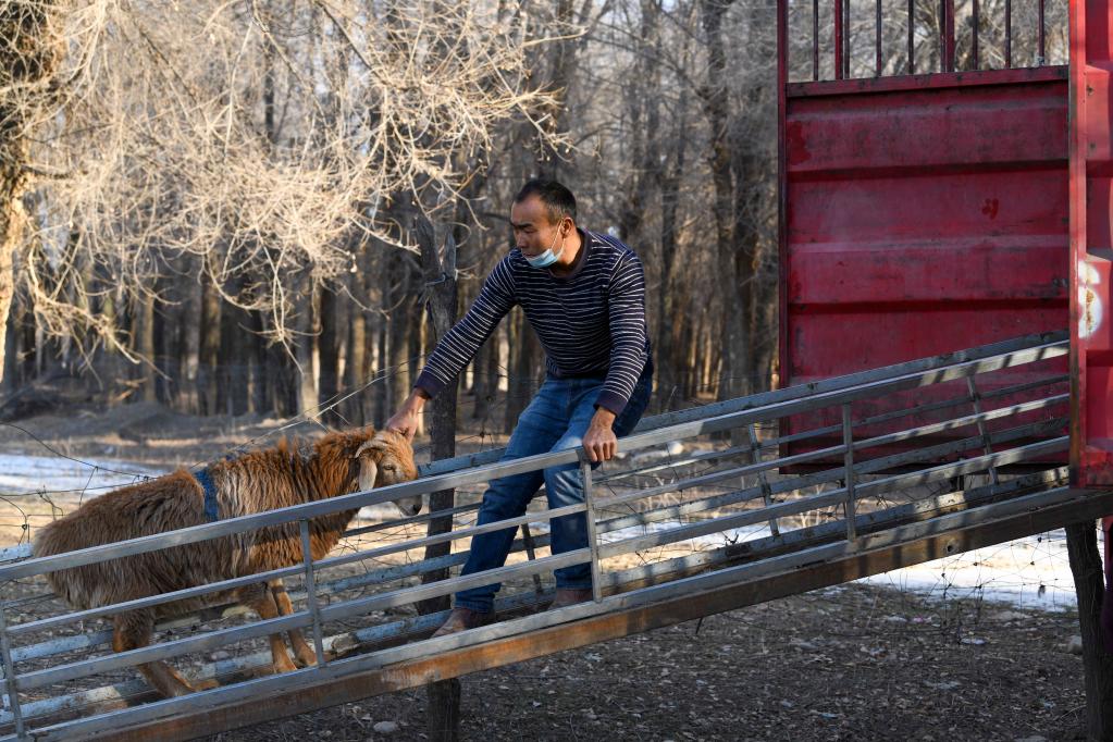 在新疆伊犁哈萨克自治州霍城县,牧民将羊拉上卡车准备进行机械化转场(11月24日摄)。新华社记者赵戈 摄