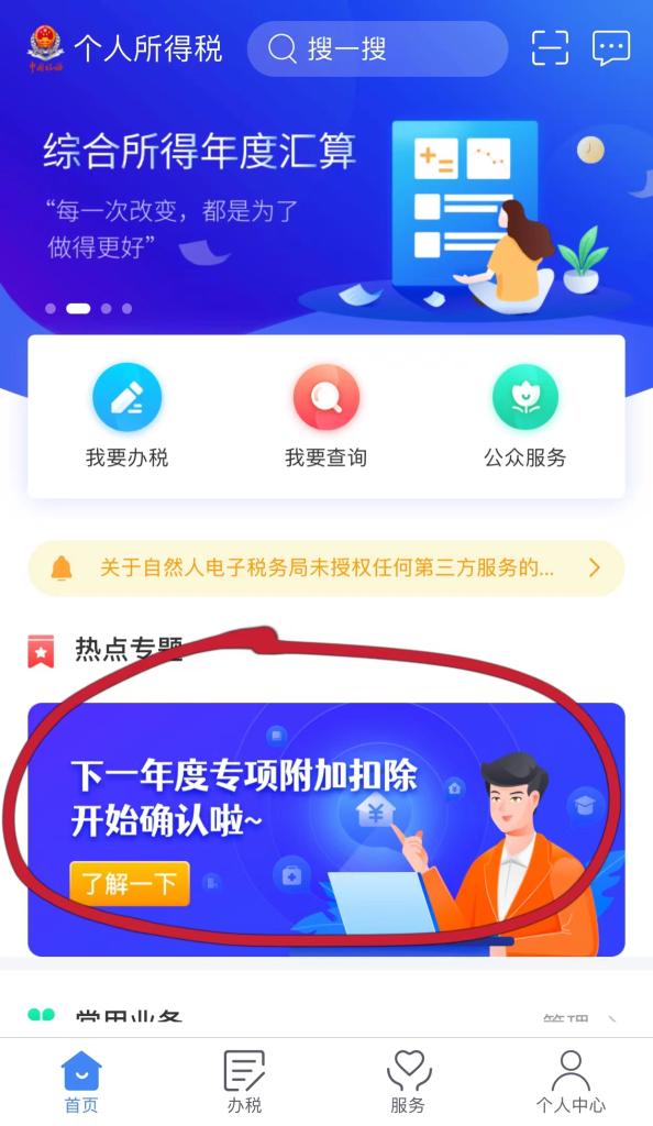 首先,进入个人所得税APP内,首页热点专题找到下一年度专项附加扣除开始确认,点击【了解一下】进入专项附加扣除页面↓↓↓