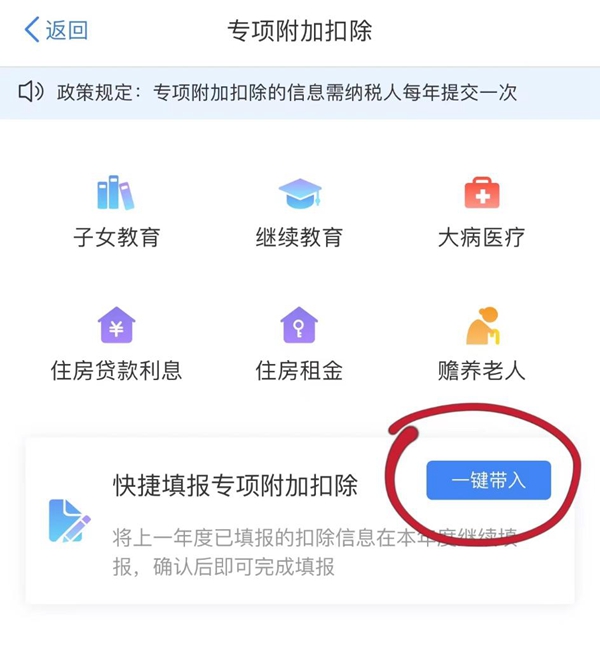 如为首次填报或有需要增加的项目,可在子女教育、继续教育、大病医疗、住房贷款利息、住房租金、赡养老人中选择填报;如没有需要修改的信息,只需要在【快捷填报专项附加扣除】栏内选择【一键带入】↓↓↓