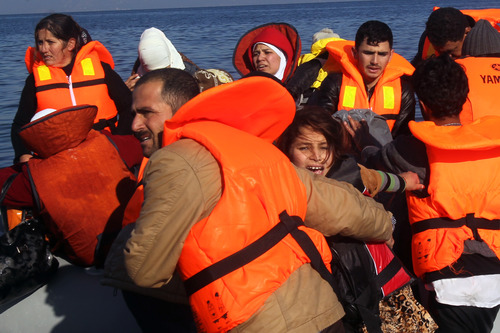 2015年11月8日,来自叙利亚和阿富汗的难民乘坐小船抵达希腊的莱斯沃斯岛。新华社发(马里奥斯·罗洛斯摄)