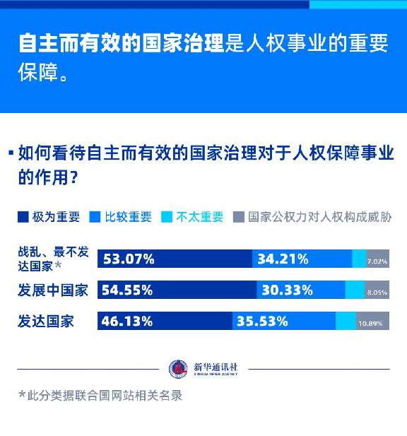 新华社这次问卷调查中,关于“自主而有效的国家治理对于人权保障的作用”,分别有超过52%和30%的受访者选择了“极为重要”或“非常重要”。