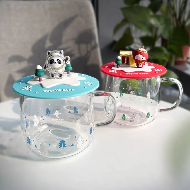 ↑北京冬奥会吉祥物的冰雪世界玻璃杯(“可爱的冰墩墩和雪容融在冬日里向你打招呼”,营造桌面上的冰雪场景,将功能性与装饰性巧妙融合)