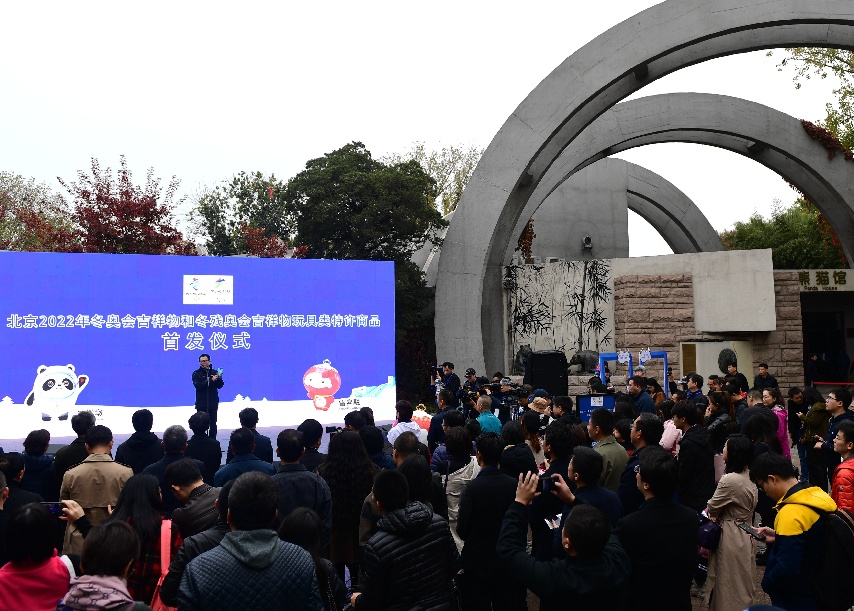 ↑2019年11月2日,北京2022年冬奥会吉祥物和冬残奥会吉祥物玩具类特许商品首发仪式在北京动物园熊猫馆举行。新华社记者 张晨霖 摄