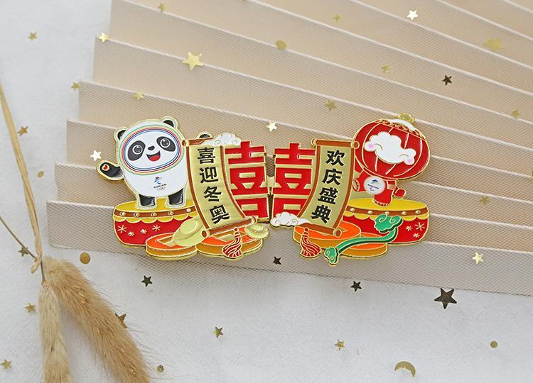 ↑北京2022年冬奥会吉祥物春节主题冰箱贴(以对联为设计原型,冰墩墩和雪容融组合后形成“囍”字)