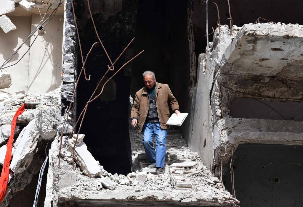 3月11日,叙利亚霍姆斯,老人哈迪·古松走在被炸毁的建筑里。(新华社发,阿马尔·萨法尔贾拉尼 摄)