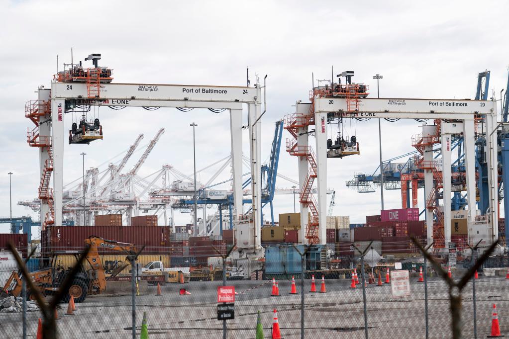 这是2021年10月26日在美国马里兰州巴尔的摩市港口拍摄的货运集装箱和起重机。(新华社记者刘杰摄)