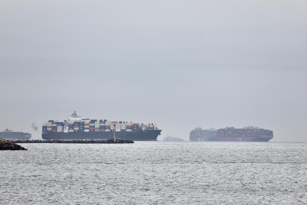 这是2021年10月22日拍摄的在美国加利福尼亚州洛杉矶附近海域等待卸货的集装箱货轮。(新华社发)