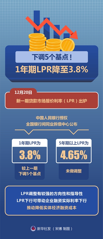 12月20日,最新一期贷款市场报价利率(LPR)出炉。中国人民银行授权全国银行间同业拆借中心公布,1年期LPR为3.8%,相较此前的3.85%下降5个基点,5年期以上LPR为4.65%,保持不变。这是1年期LPR今年内的首次下调,也是2020年4月之后的首次下调。