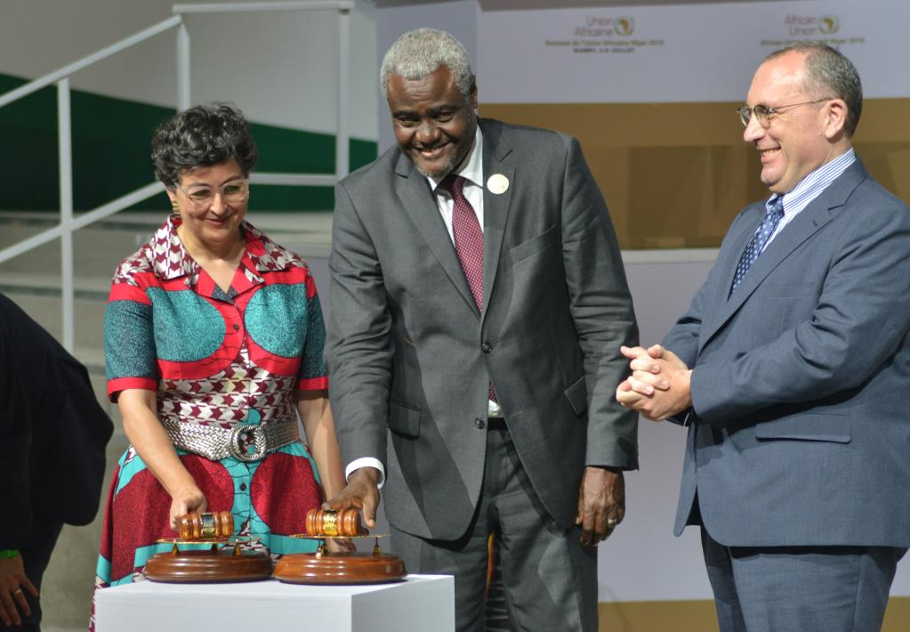 2019年7月7日,在尼日尔首都尼亚美,非盟委员会主席法基(中)宣布正式启动非洲大陆自贸区建设。(新华社发)