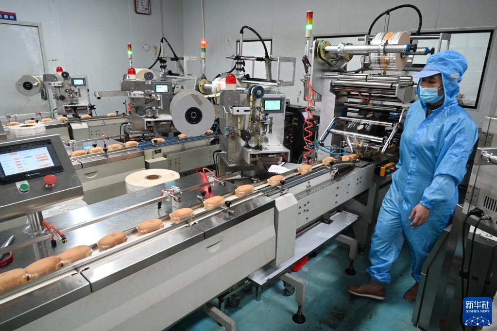工人在位于福建漳州的卡尔顿公司蛋糕包装车间工作(2021年11月19日摄)。新华社记者 林善传 摄