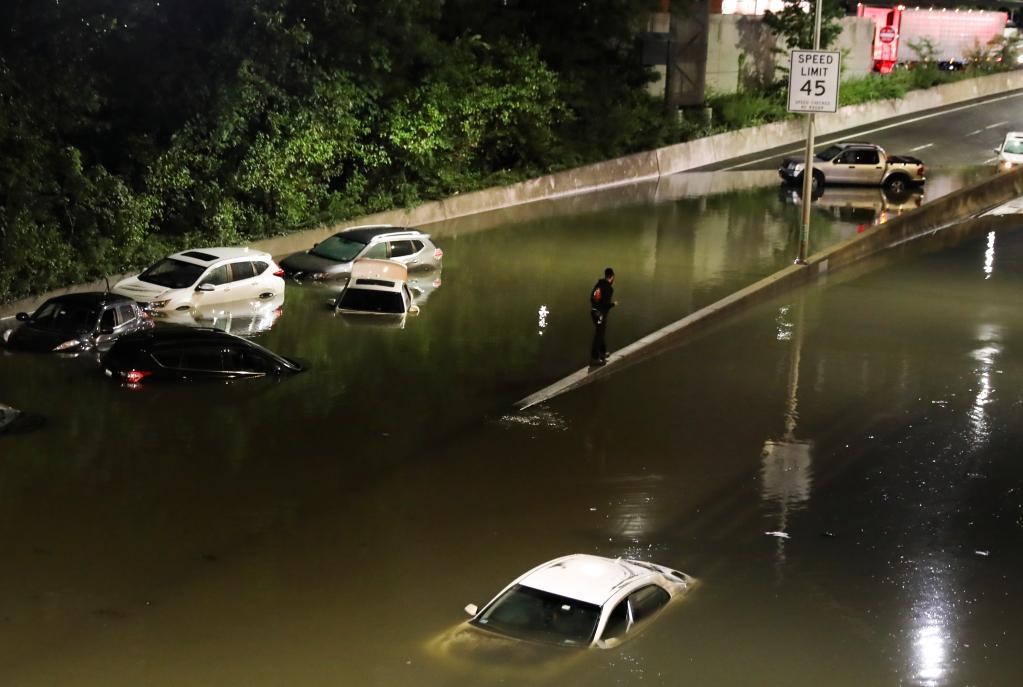 2021年9月2日,美国纽约一条主要道路上的车辆被积水淹没。受飓风“艾达”影响,暴雨9月1日晚开始袭击纽约市及周边地区,并引发洪涝灾害。(新华社记者 王迎 摄)