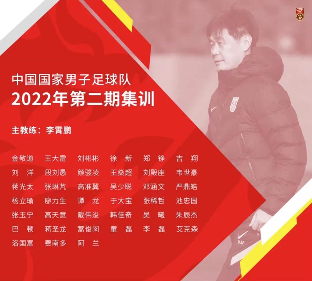 新华社北京2月22日电 22日,中国男子足球队公布新一期39人集训名单,球队将于3月3日在海口开始集训,备战剩余两场2022年世界杯预选赛12强赛。