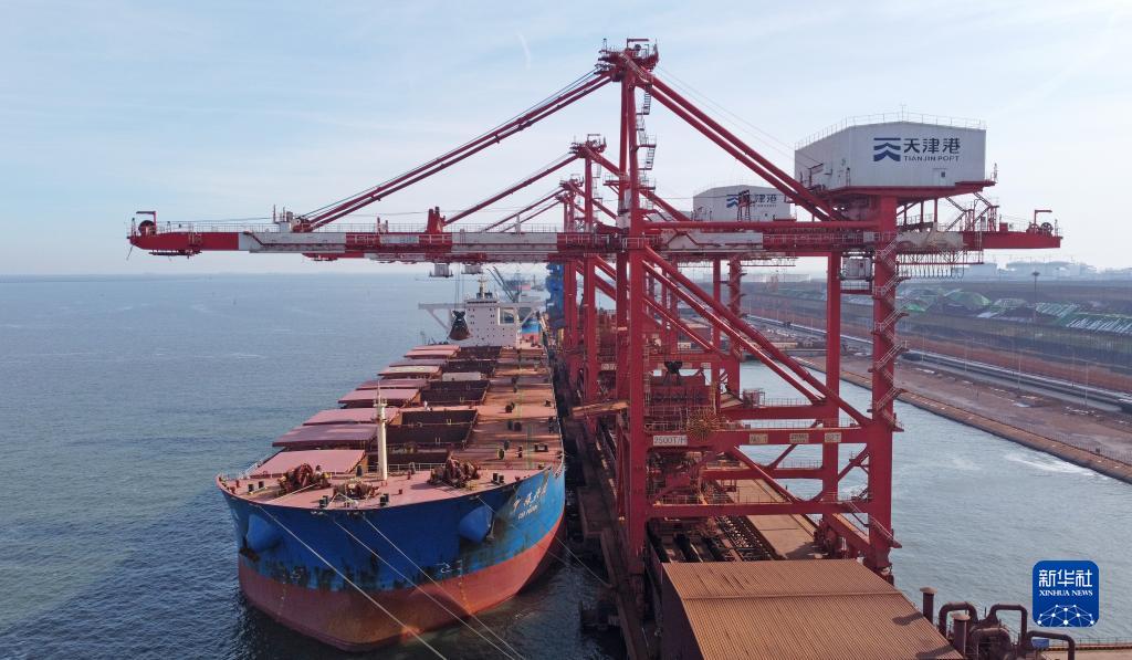 在天津港南疆港区26泊位,卸船机在进行卸货作业(1月28日摄,无人机照片)。新华社记者 赵子硕 摄