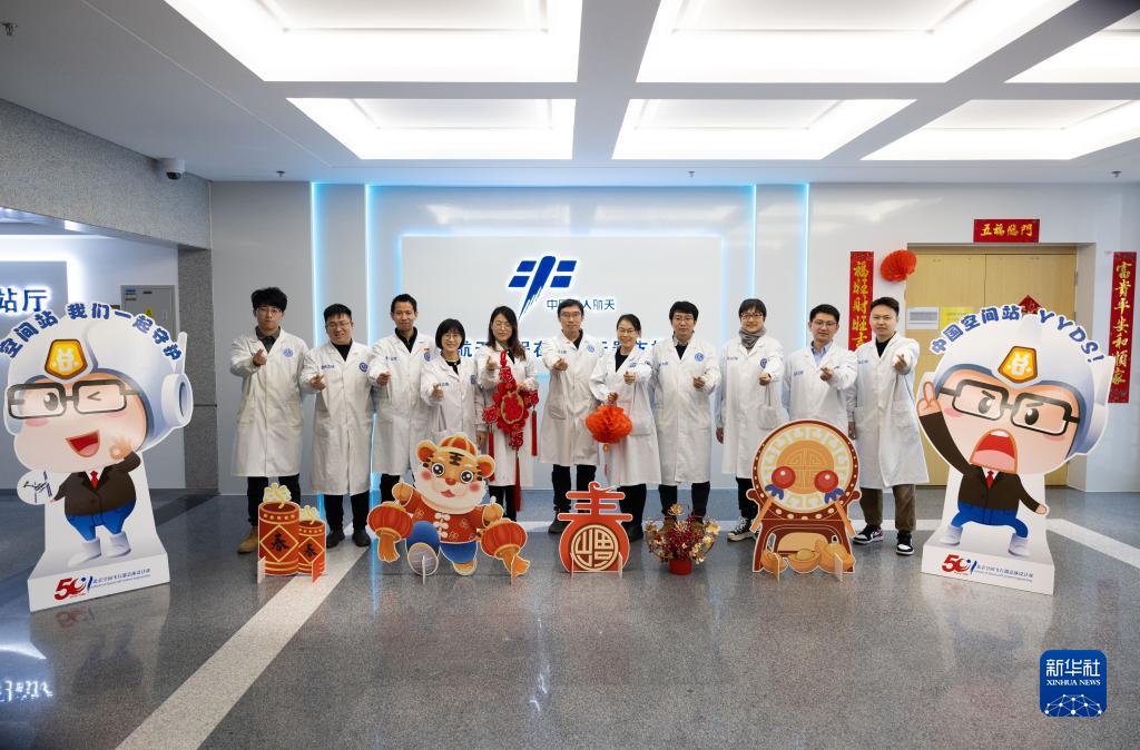 1月30日,在航天科技集团五院在轨航天器支持中心数字空间站外,空间站任务飞控试验队科研人员合影留念。新华社记者 金立旺 摄