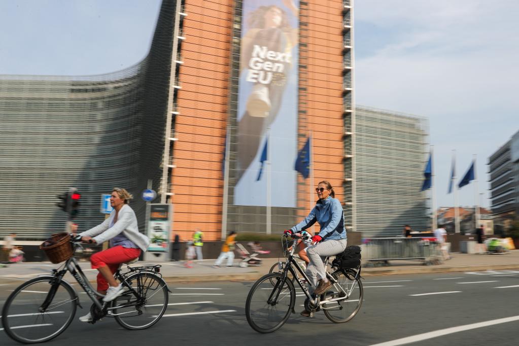 2021年9月19日,在比利时布鲁塞尔,人们骑车经过欧盟委员会总部大厦。(新华社记者郑焕松摄)