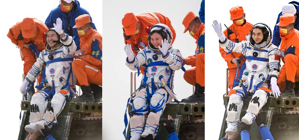 2022年4月16日,神舟十三号载人飞船返回舱在东风着陆场成功着陆。这是航天员翟志刚、王亚平、叶光富(左至右)安全顺利出舱(拼版照片)。新华社发