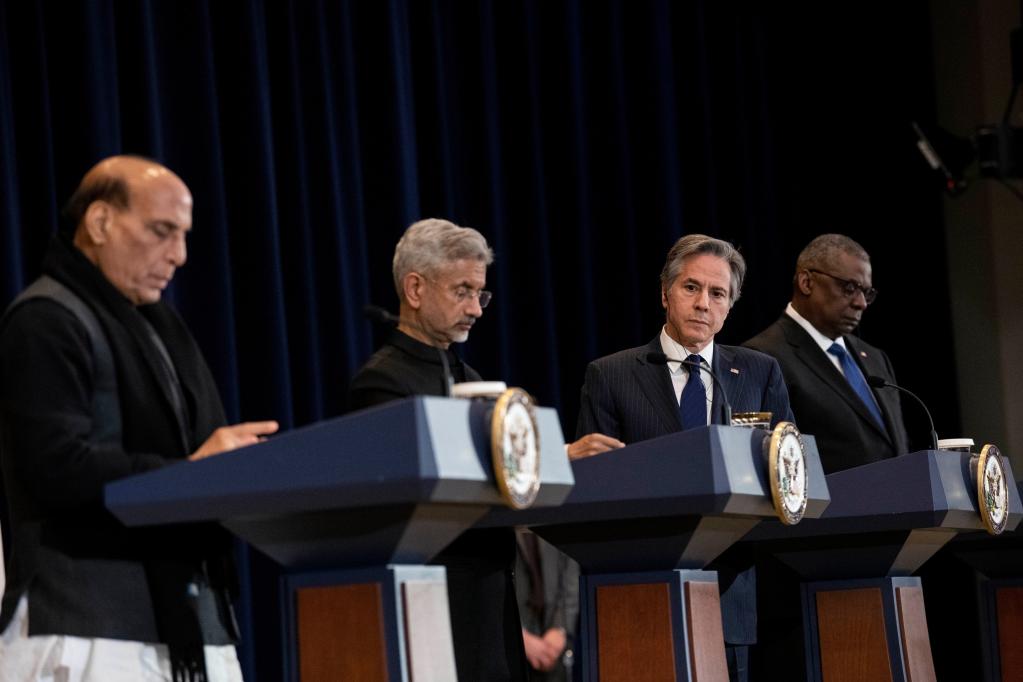 4月11日,在美国华盛顿,美国防长奥斯汀、美国国务卿布林肯、印度外长苏杰生、印度防长辛格(从右至左)举行联合记者会。新华社记者刘杰摄