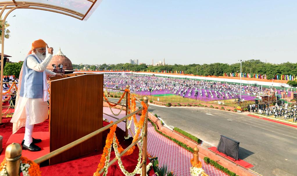 2021年8月15日,印度总理莫迪在德里举行的独立日庆祝仪式上讲话。新华社发(印度新闻局供图)